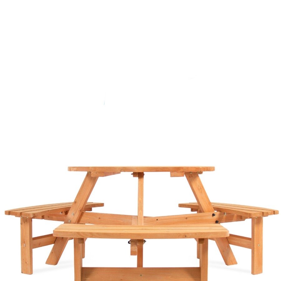 This Outdoor Circular Wooden Picnic Table w/ Benches Umbrella Hole - Seats 6 is perfect for a meal in any area of your backyard - place it on the patio, in your garden, or underneath your favorite tree. The picnic table holds a maximum of 500 pounds, allowing up to 6 adults to gather 'round on connected benches for good food and company; accommodates 2 people per bench. A drilled hole in the center of the table is the perfect size to fit a patio umbrella and provide shaded outdoor lounging. Umbrella not included.